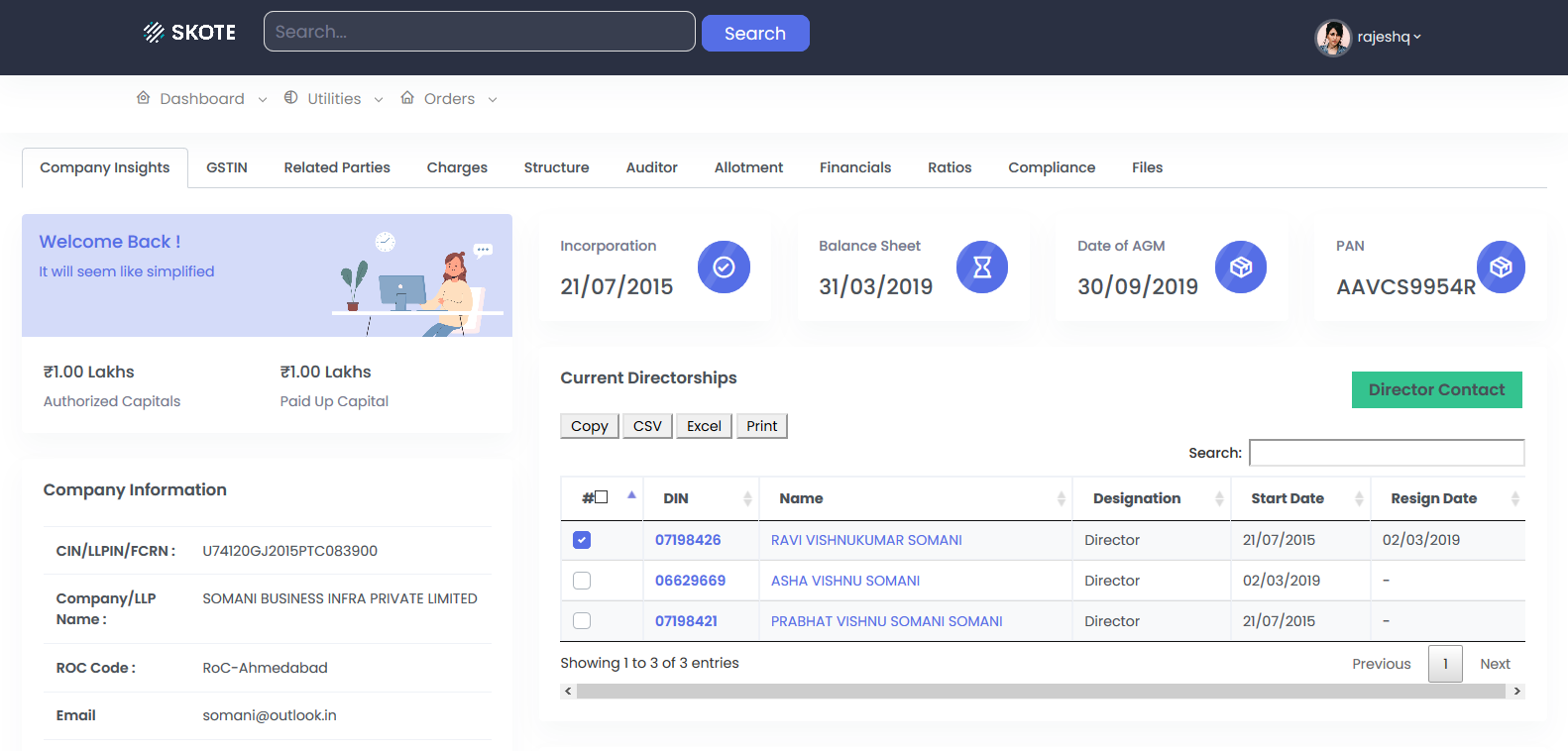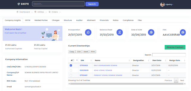 Search for the Company's Director Details you are looking for : (For example we look for Somani Business Infra Private Limited) and select the directors for whom you need the details as below, then click on the Director Button on right hand side top of the table.