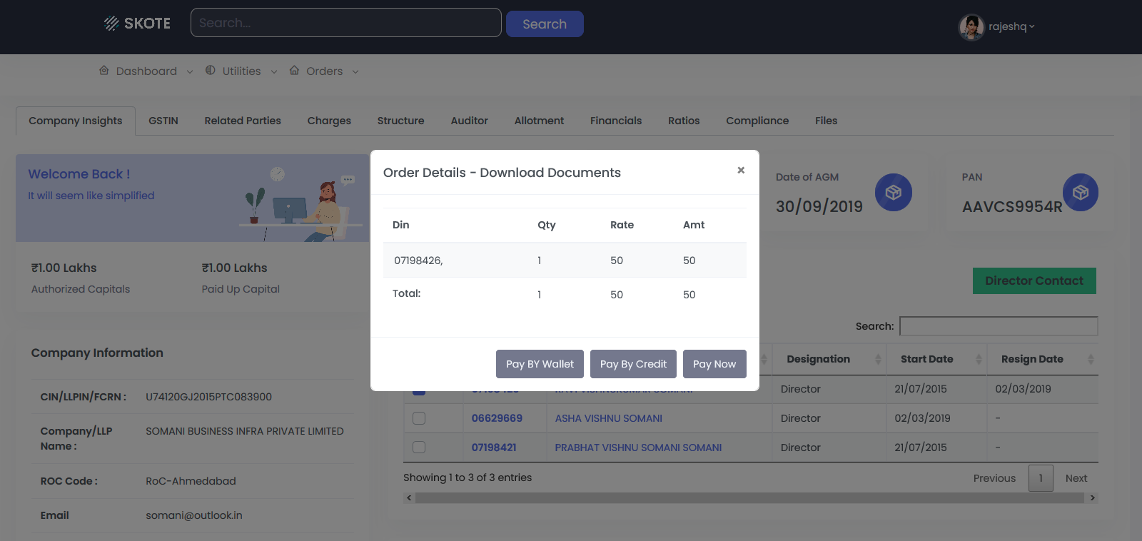 You will be prompted for the payment part and you may use you rcredit, wallet or make the instant payment online via payment gateway, Once you are done with the payment part, you will get the details on the screen when you click on the directors link (DIN No.).